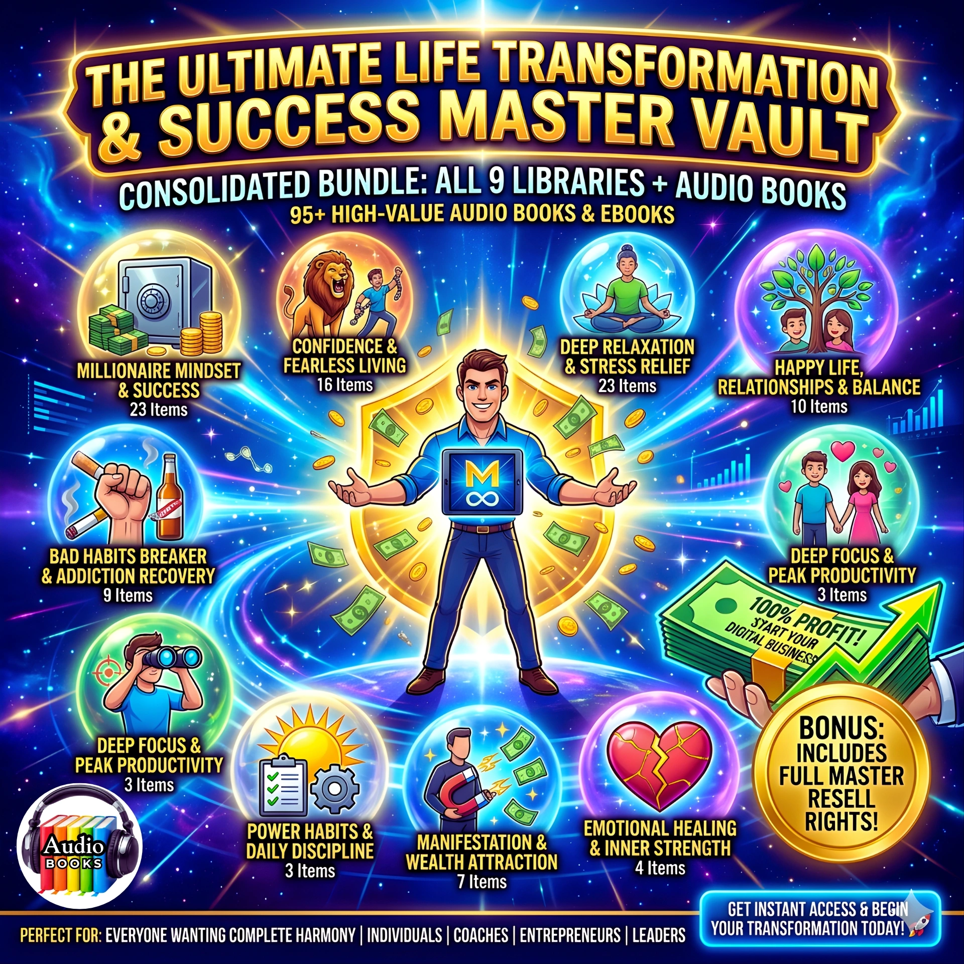 The Ultimate Life Transformation & Success Master Vault consolidates our 9 most powerful libraries into one massive, discounted bundle. This is a “business-in-a-box” and a personal growth sanctuary combined.